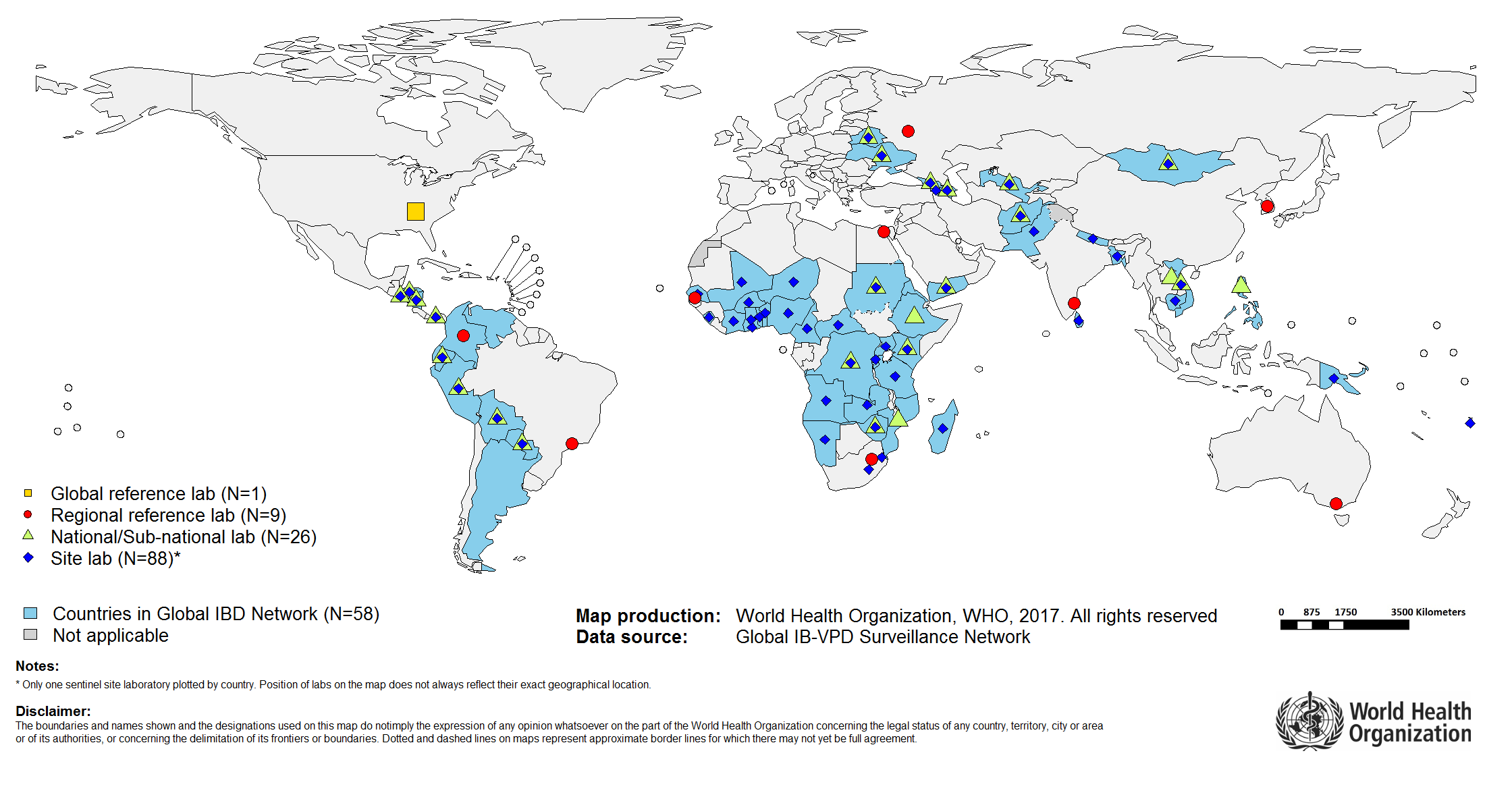 As of December 2017, the network includes 88 Sentinel Hospital Laboratories (SHL), 26 National Laboratories (NL), nine Regional Reference Laboratories (RRL), and one Global Reference Laboratory (GRL). The initial laboratory testing for diagnosis is conducted at the SHL and additional testing such as strain characterization (serotyping/serogrouping) is done at the NL or RRL.