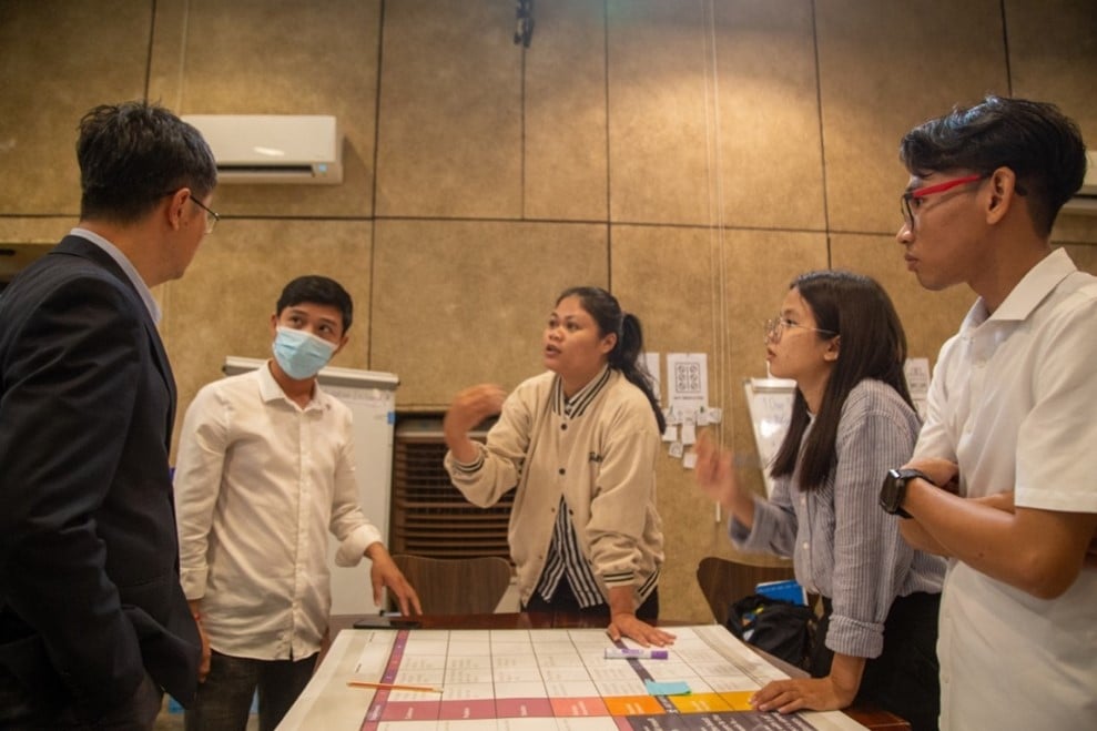 A group of students discuss their plan for an idea validation experiment with their designated mentor, Kelvin Tan (left), a temporary advisor to WHO. © WHO/Shunsuke Miyatake